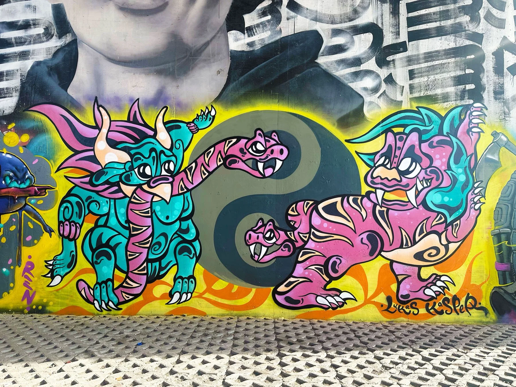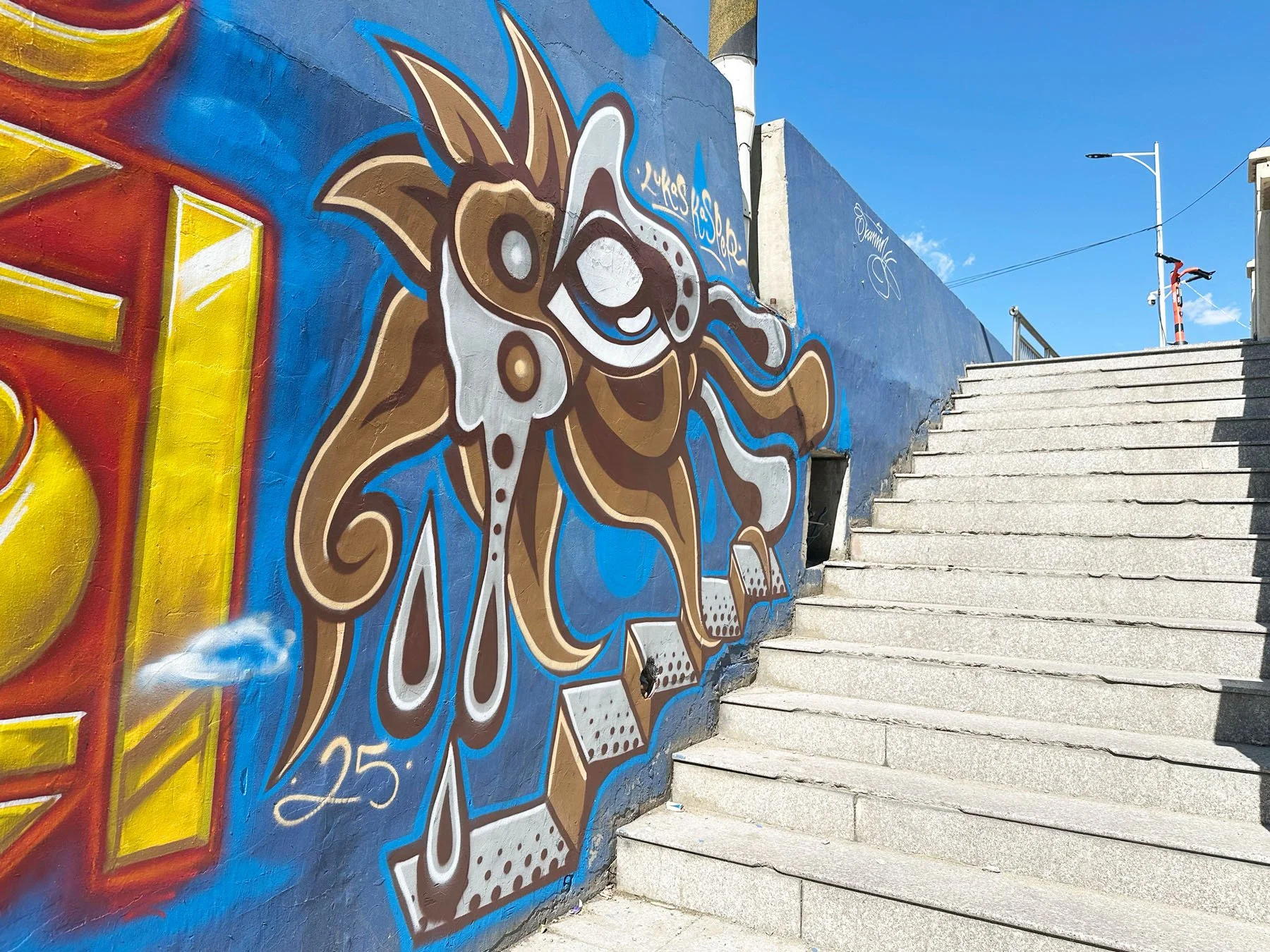The final piece of the trip in Ulaanbaatar was at another bridge wall. For this one, I drew inspiration from a wooden chest I had seen in town, which depicted a battle scene between two characters. I reimagined those figures in my own style, closing out the adventure by bringing a piece of the local history into my work one last time.