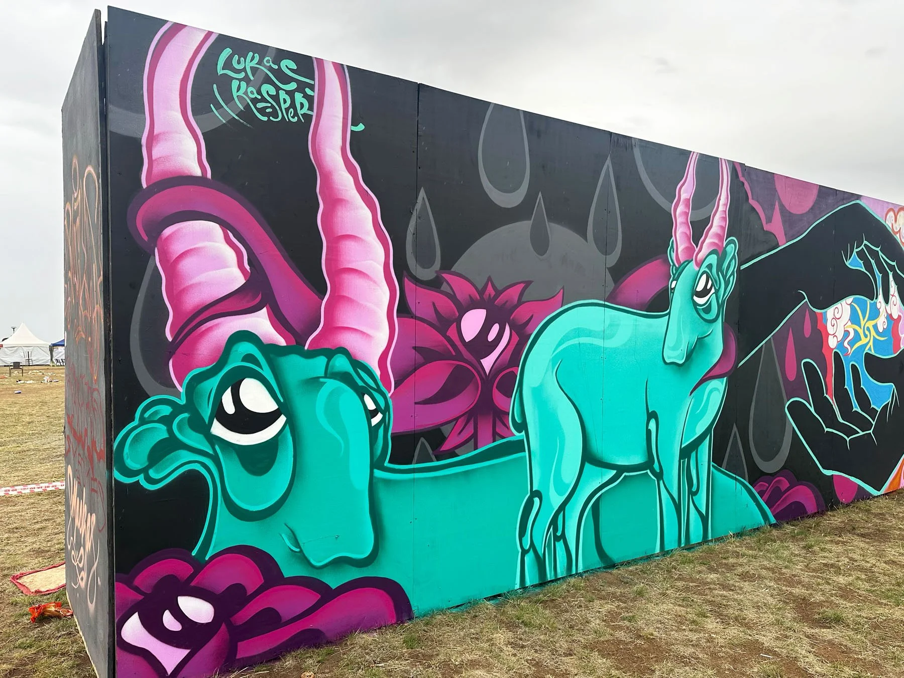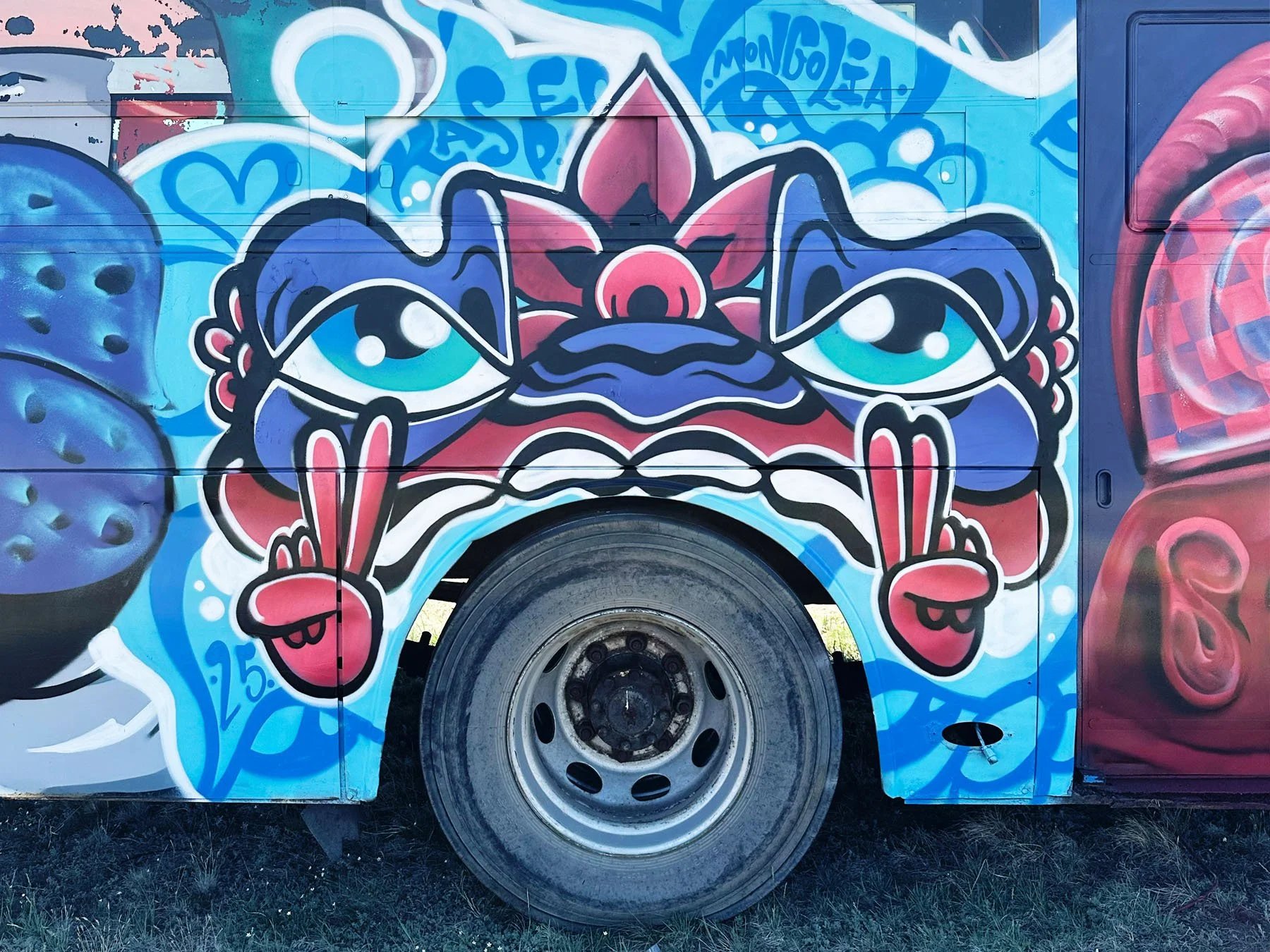 While at the festival, our team stored paint inside an old bus. With some spare time, we decided to give it a facelift. The result was a fun, laid-back jam session with the other artists, turning a simple storage bus into another layer of the festival’s creative energy.