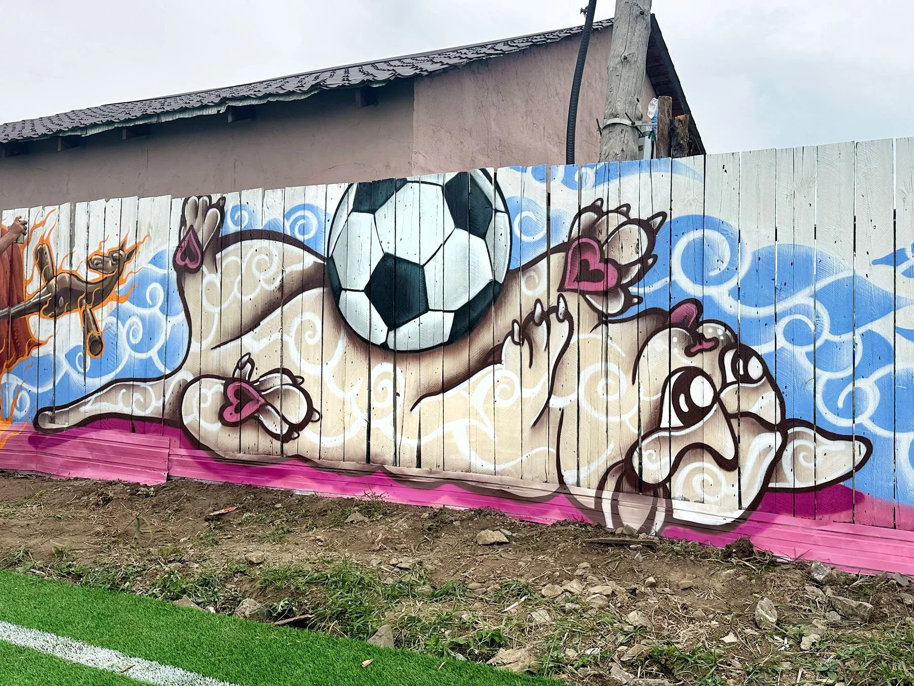 One of the most rewarding walls of the trip was at a youth centre in the Ger district, painted beside their brand-new soccer field. I created a mural of a cat playing with a soccer ball, which the kids helped me paint. Afterwards, we kicked the ball around together — it was one of those moments where art breaks down barriers and creates simple, genuine connections.