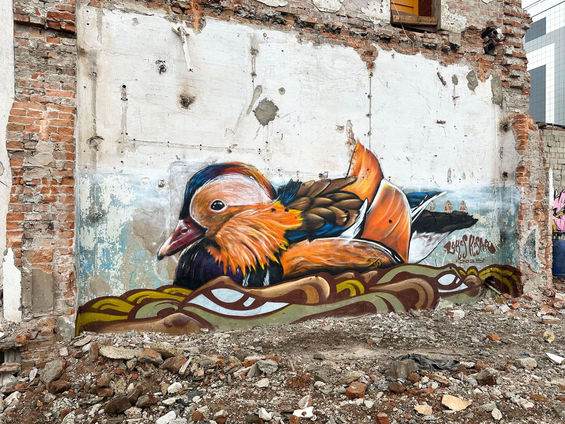 We found a decaying abandoned building in the city and turned it into a playground for creativity. I painted a mural inspired by a brilliantly coloured local duck. At first, I wasn’t sure how bright colours would look against crumbling concrete, but in the end, the contrast between decay and vibrancy made the piece stand out in an unexpected way.