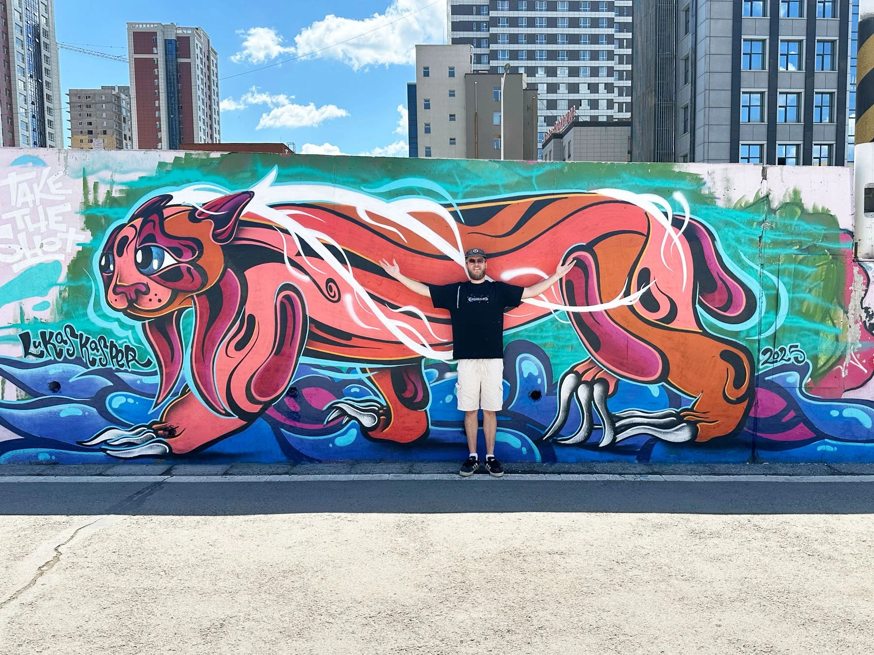 In 2025 I spent a month travelling through Mongolia and Inner Mongolia on a painting mission. I started out in Ulaanbaatar, linking up with local artists and painting almost every day — whether it was planned murals, community projects, or quick pieces in between. When I wasn’t on a wall, I was sketching ideas for future murals and soaking up inspiration from the places and people around me.