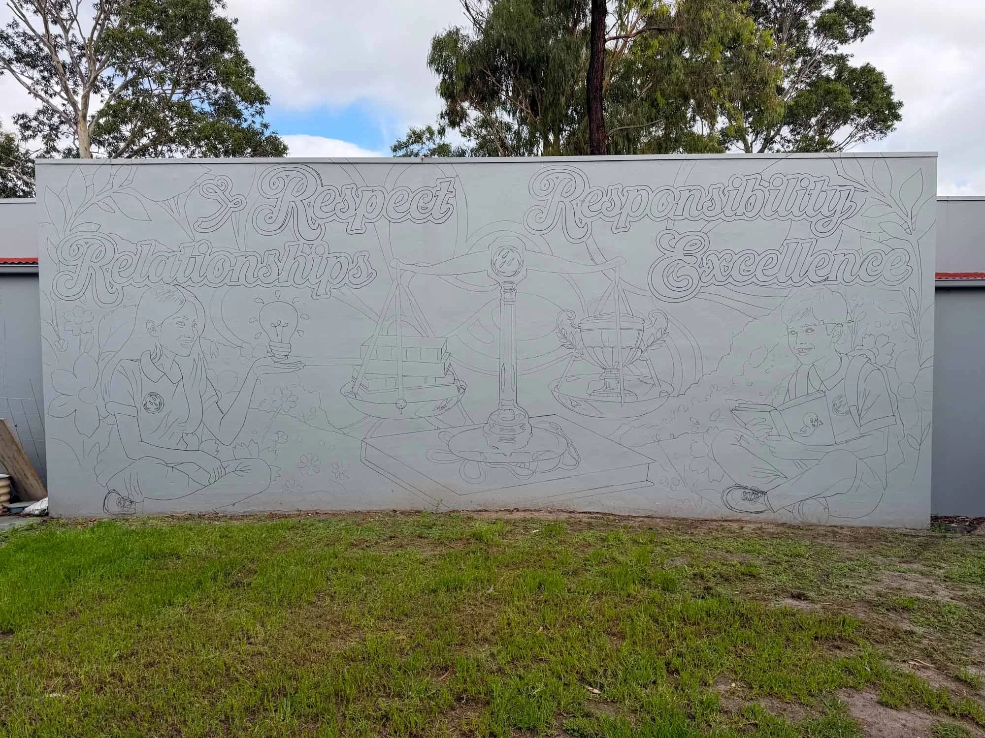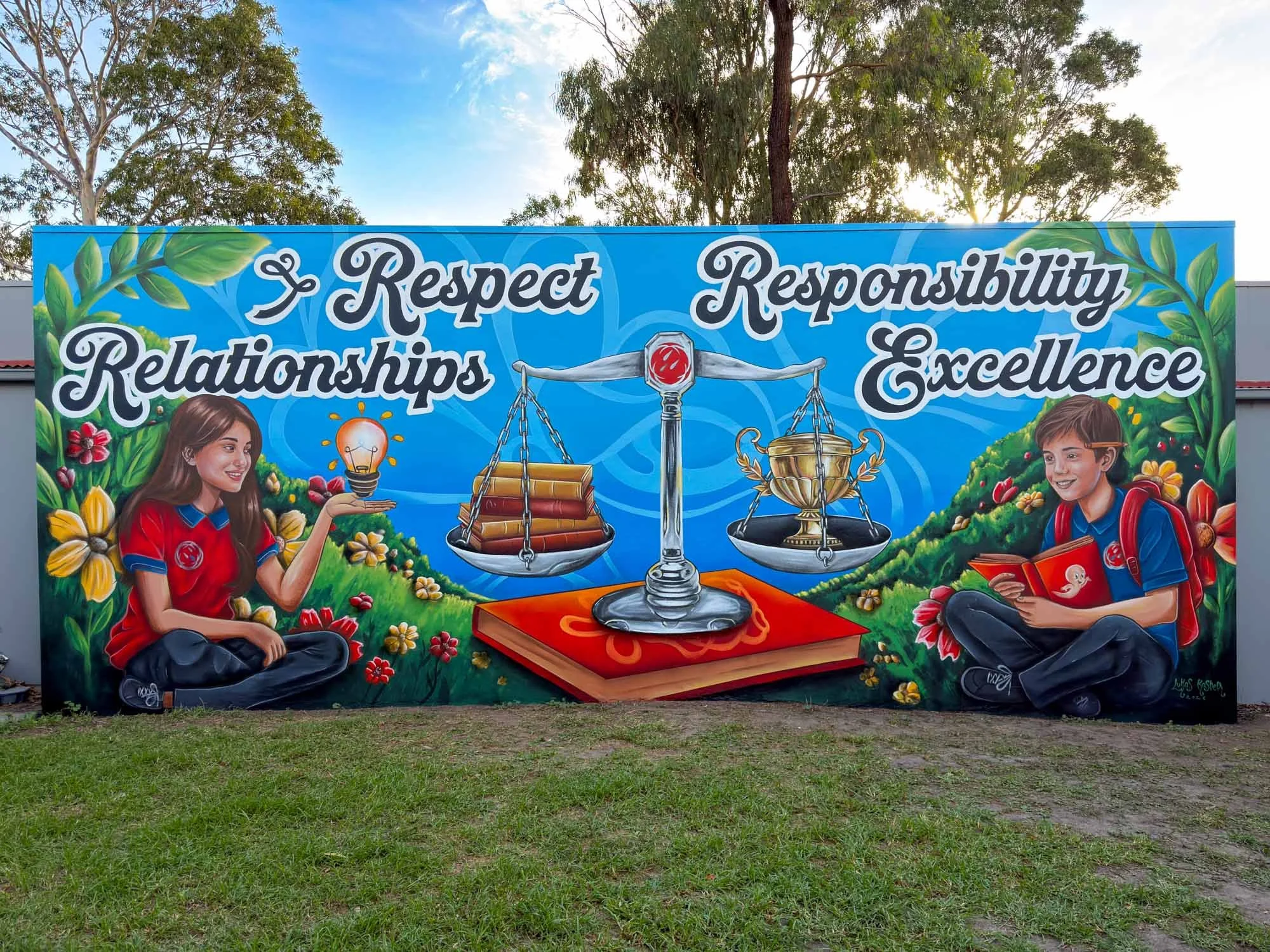 At Copperfield College Kings Park in Melbourne’s western suburbs, this mural was developed as a collaborative project centred around student voice and creative expression. In the early stages, I worked closely with the students to explore what their school values meant to them, encouraging them to share. These conversations played a key role in shaping the overall concept and direction of the design.